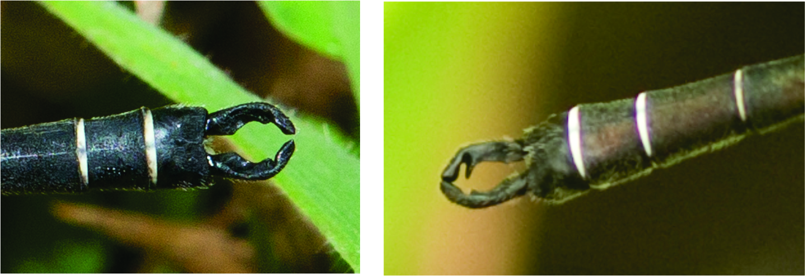 New England Flatwings are difficult to distinguish from Barrington Flatwings (Austroargiolestes brookhousei). The tips of the anal appendages just meet when the inner bases are parallel in the male New England Flatwing, whereas the tips overlap in the male Barrington Flatwing.