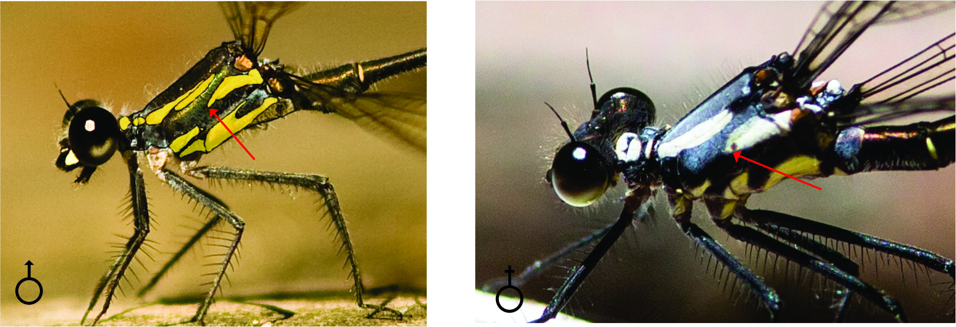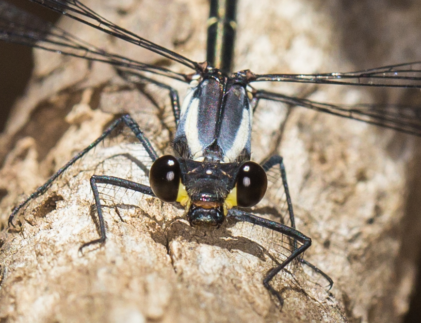 The Milky Flatwing superficially looks like the Common Flatwing (Austroargiolestes icteromelas) especially the very young ones that have not yet developed the milky pruinescence which must give them their common name. Even though the damselfly photos here are taken from slightly different angles, you can see that the point of the posterior lateral thoracic marking (indicated by a red arrow) is much less acute on the Milky Flatwing than the Common Flatwing. The bottom lateral markings differ as well but it is difficult to take photos that show them well.