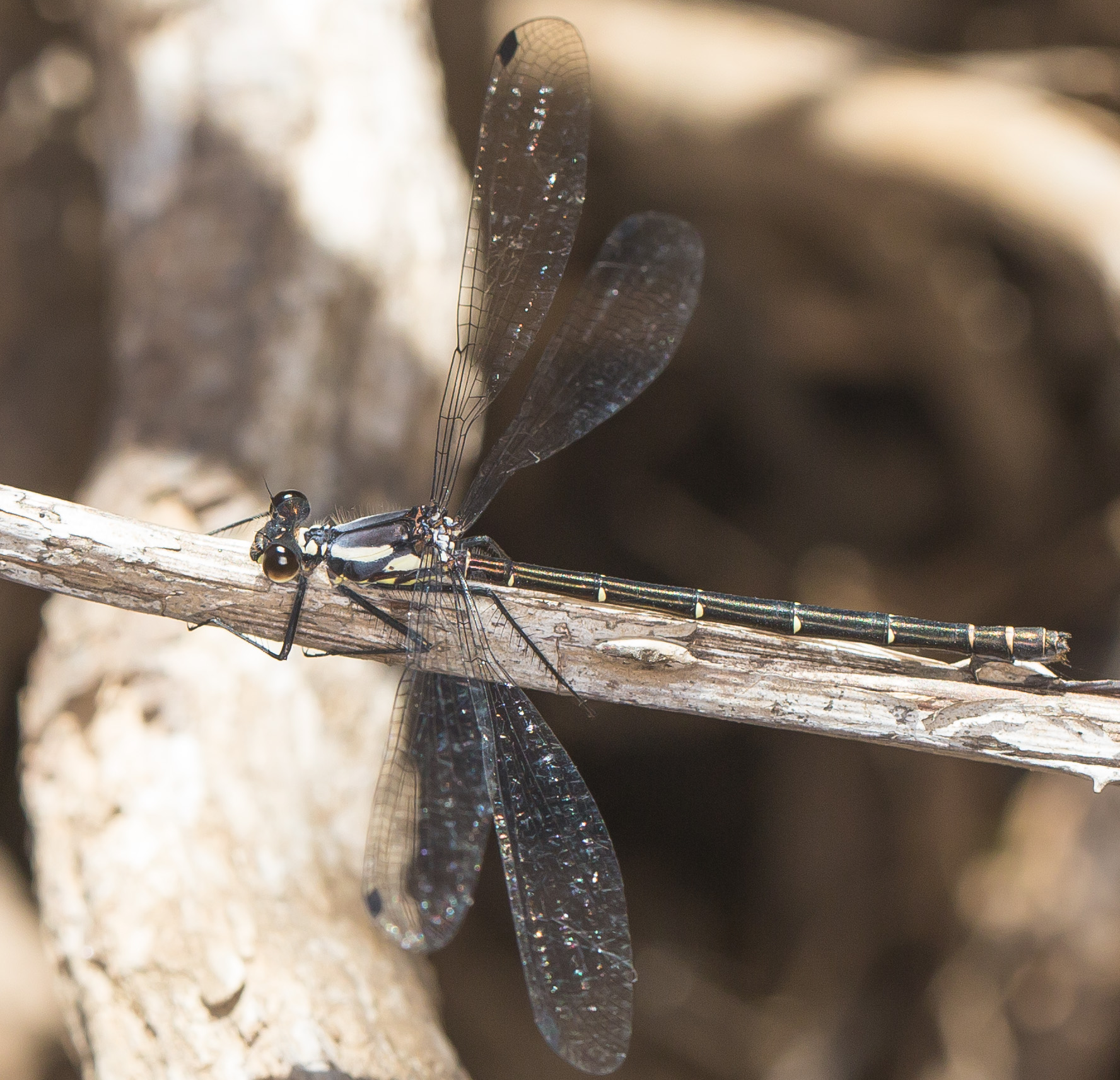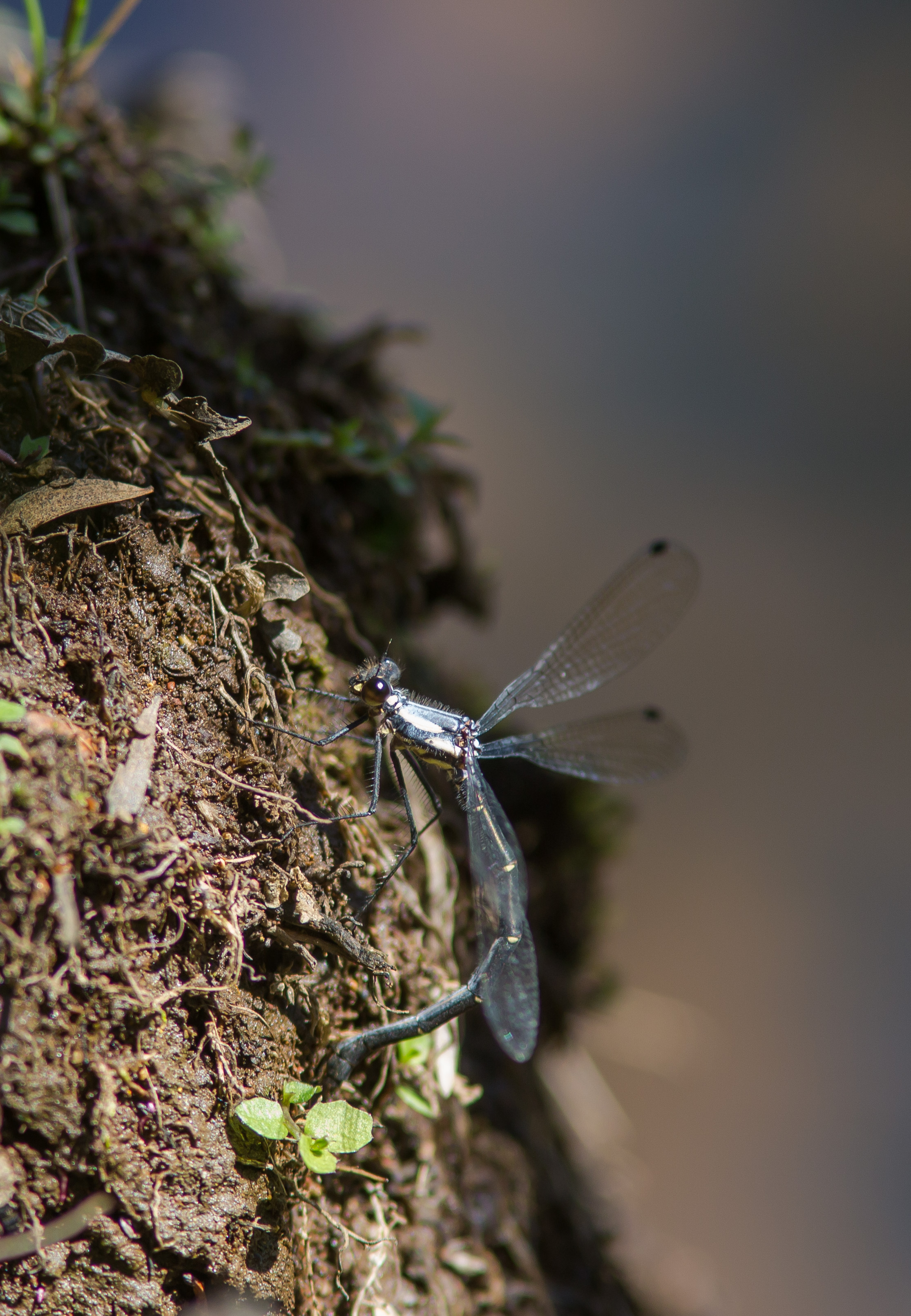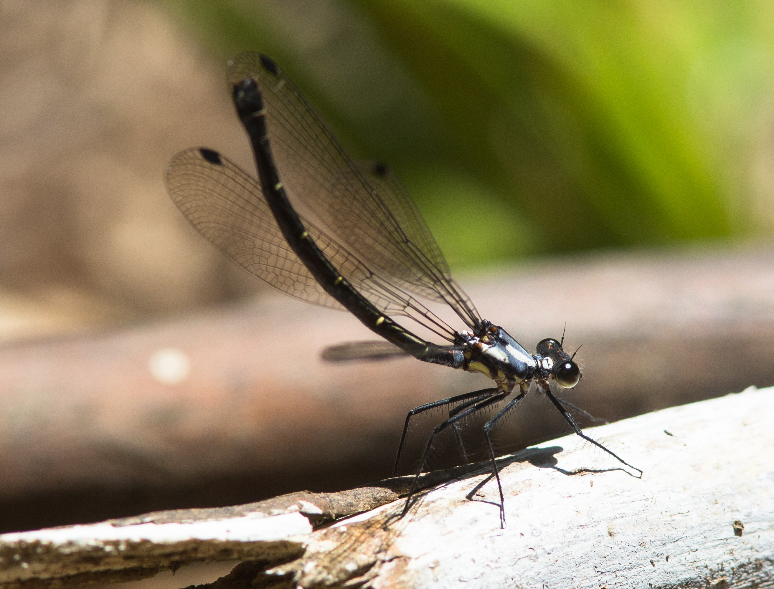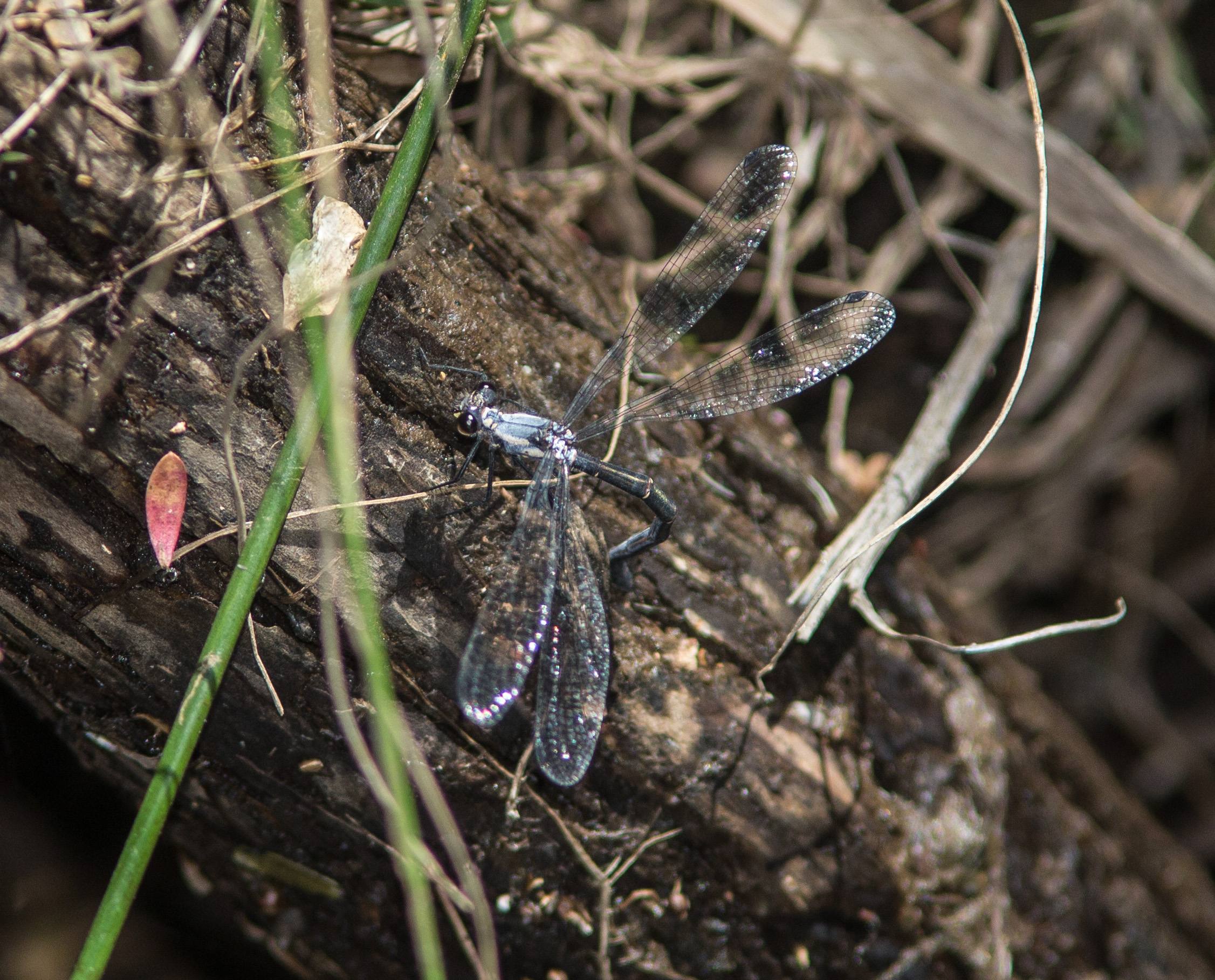 The Milky Flatwings around Deer Vale seem to favour small creeks which are mostly enclosed with shrubs. They often sun themselves on dead wood in small sunny openings along the creek. On November 27th 2013, in one such opening, I came across 2 females. These females had quite dark thoracic markings and one had a scar on segment 4 of her abdomen. I sat down to watch when another female with white markings arrived. One of the older females flew onto the vertical bank of the creek and started laying eggs into the dirt. Shortly after, a 4th Milky Flatwing arrived - a male this time - but he only stayed about 8 minutes before flying off.
