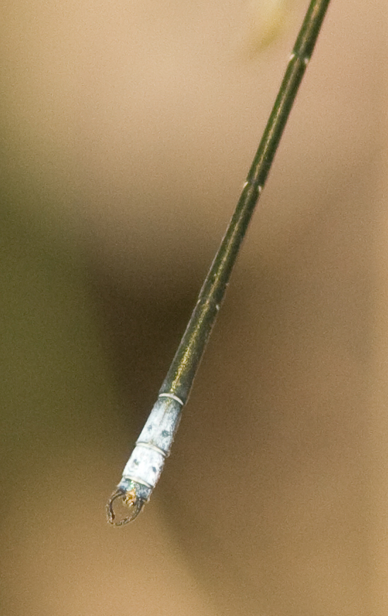 The coastal flatwing does not have the distinct white patches on the medial lobe of the pronotum as the grey-chested flatwing does. Also its pterostigmas are much darker. At left is a close-up of the anal appendages of a male Coastal Flatwing. The superior anal appendages are evenly curved and the inferior appendages are short and blunt.