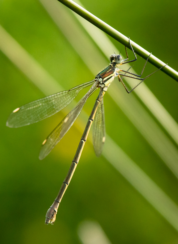 Synlestes weyersii are large damselflies which usually land with their wings spread but occasionally they will slowly close them. The pterostigmas are white or a pinky colour in old specimens.