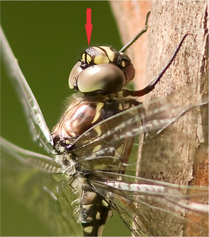 Like the Blue-spotted Hawker, Adversaeschna brevistyla, the male Swamp Darner has angular hind wing bases while the female has rounded hind wing bases.