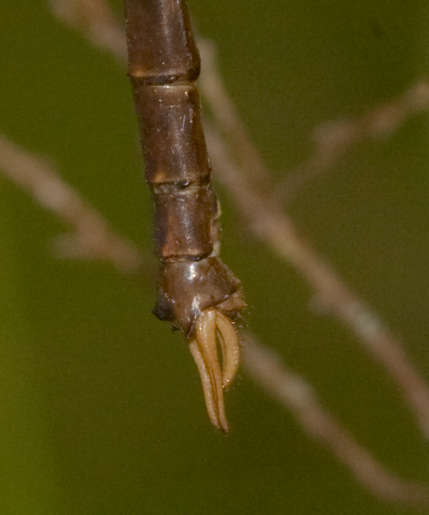 The superior anal appendages of the Eastern Evening Darner are very long and pointed compared to its inferior ones.