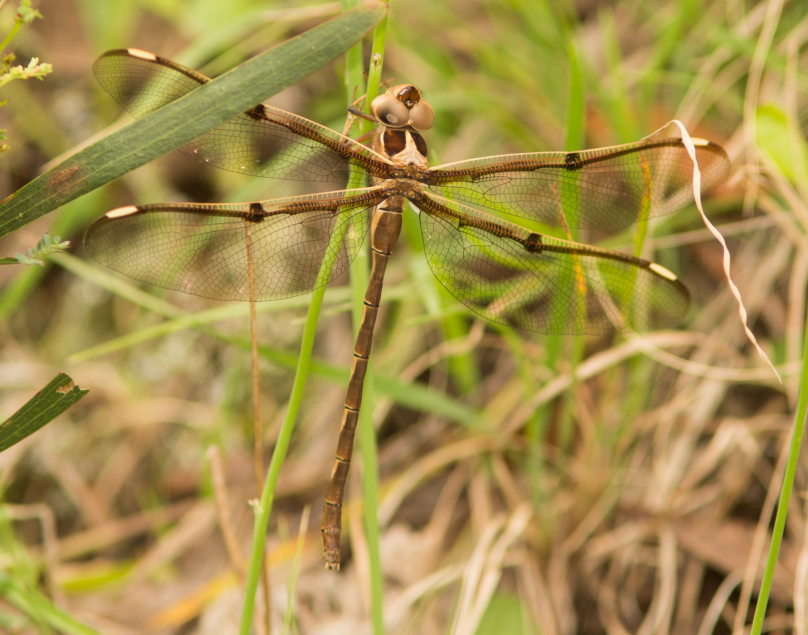 The sky was showing signs of an afternoon storm brewing but I decided to go walking at a nearby swamp anyway. At the edge of this swamp that had a little creek running through it, I spotted a large brown dragonfly flying very slowly and low to the ground. I thought at the time that it looked like a pencil with wings flying. It landed on the trunk of a bush close to the ground where I was able to get a few photographs. It started to vibrate its wings warming them ready for flight. It then flew slowly down the creek and disappeared into another shrub. It was an Eastern Evening Darner - Telephlebia godeffroyi. This Darner usually flies at dusk.