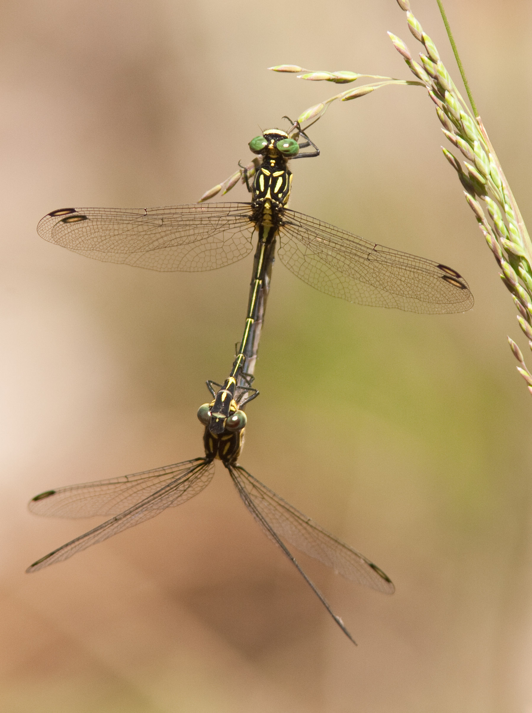 The Jade Hunter - Austorgomphus ochraceus is very similar to the Yellow-striped hunter - Austrogomphus guerini. The Yellow-striped Hunter has an almost full length yellow mid-dorsal stripe on each abdominal segment 2-9 while the Jade Hunter differs in having very short dorsal stripes on segments 8 and 9. The thoracic markings are also different in that the antehumeral stripe is joined to the collar on the Yellow-striped Hunter but not on the Jade Hunter.
